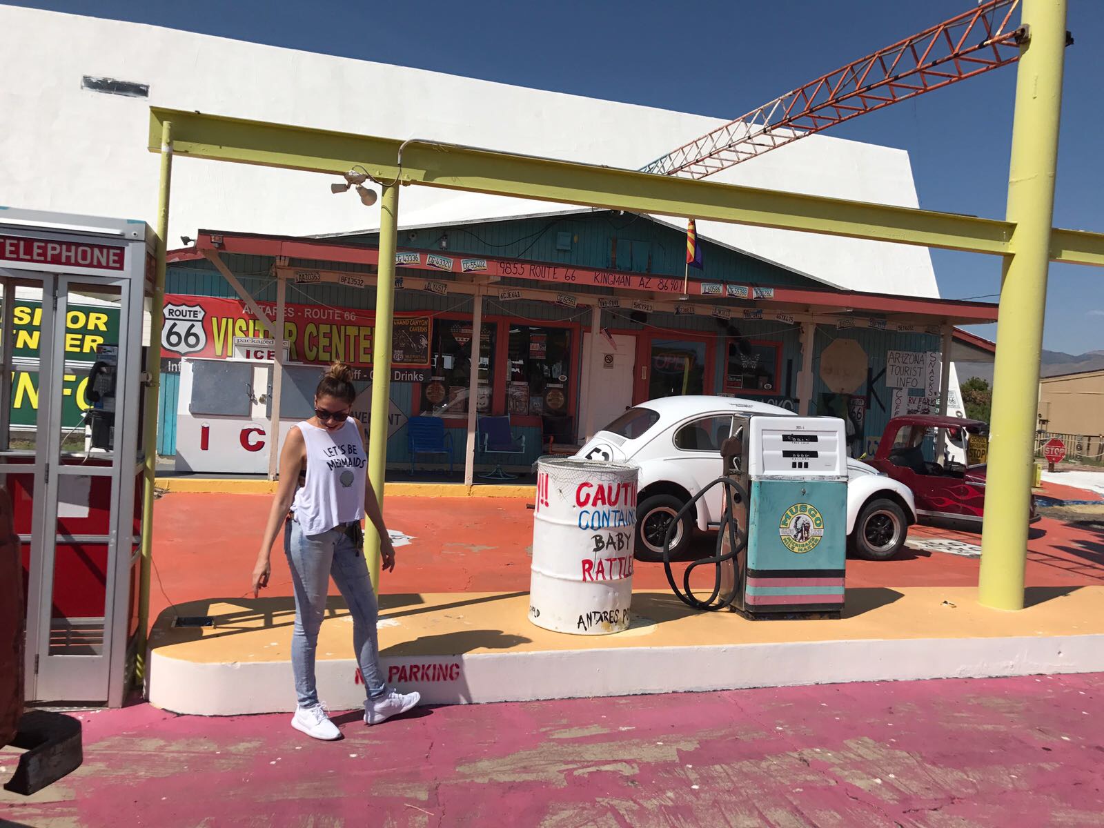 Una gasolinera antigua, reconvertida en tienda de souvenirs, con un escenario digno de volverse loco a sacarse fotos. Un gran homenaje sin duda a la histórica Ruta 66 al aire libre, donde comprar cualquier recuerdo que lleve el número 66.