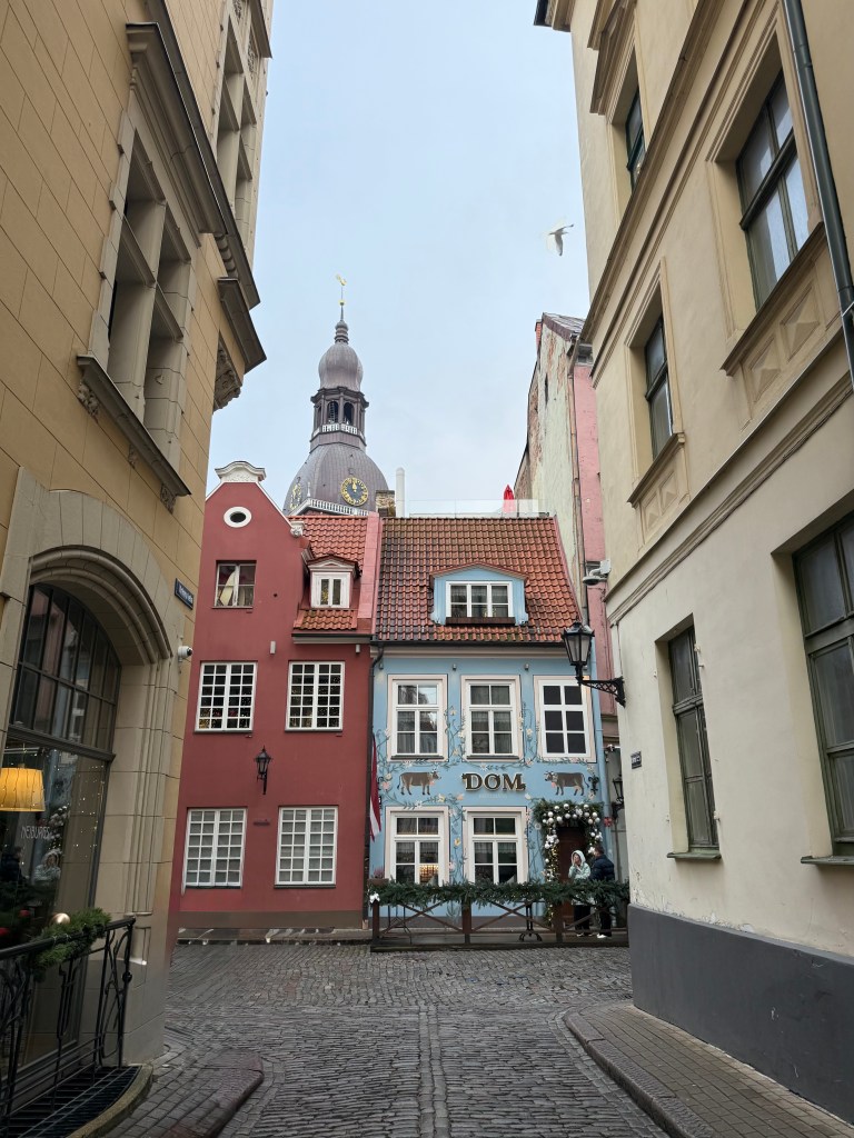 Uno de los rincones más fotografiados de la ciudad. La fachada celeste y el callejón de enfrente se han convertido en un spot icónico de Riga.